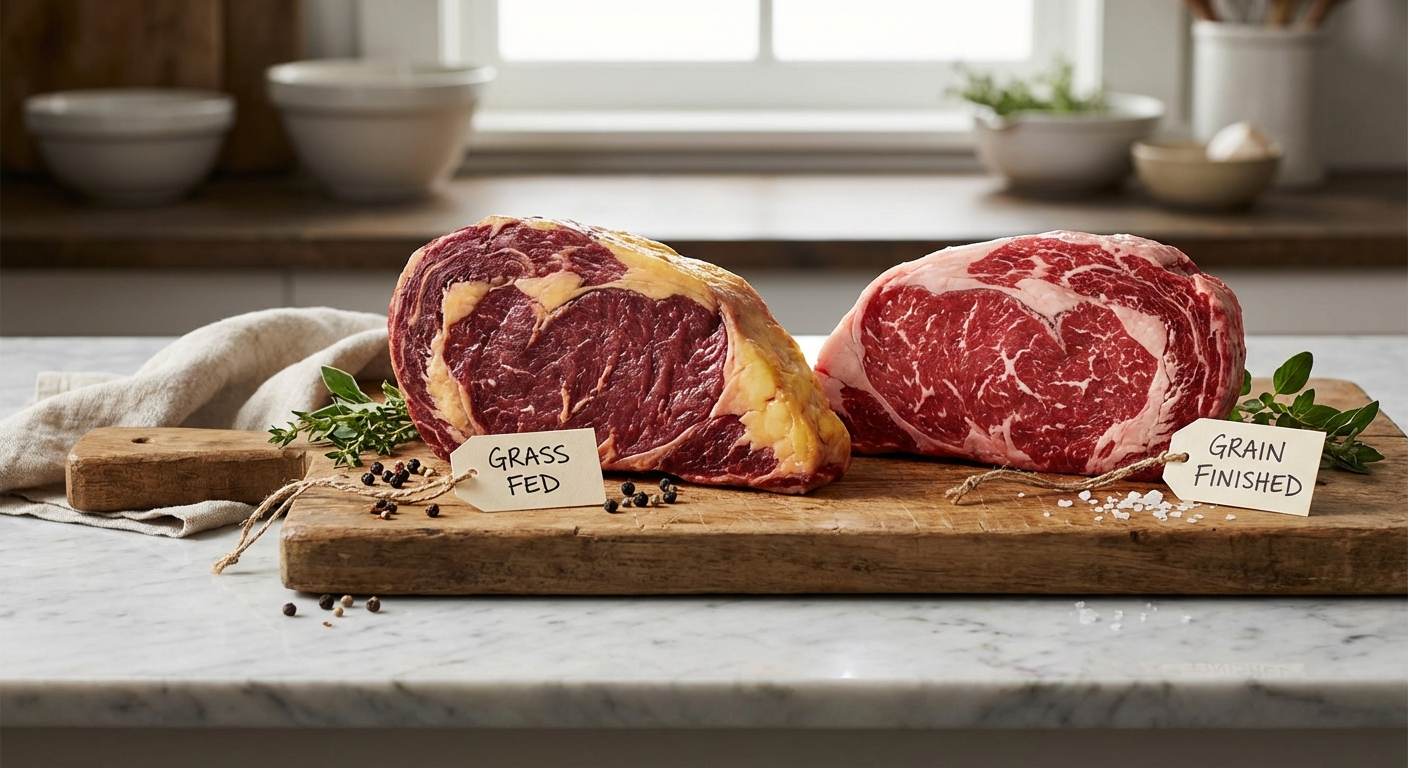 - Budget matters. Dollar for dollar, grain-finished offers more marbling and tenderness. A $12/lb Choice grain-finished ribeye will out-eat most $18/lb grass-fed ribeyes in a blind tasting — not because grass-fed is bad, but because marbling is king for steak satisfaction.
